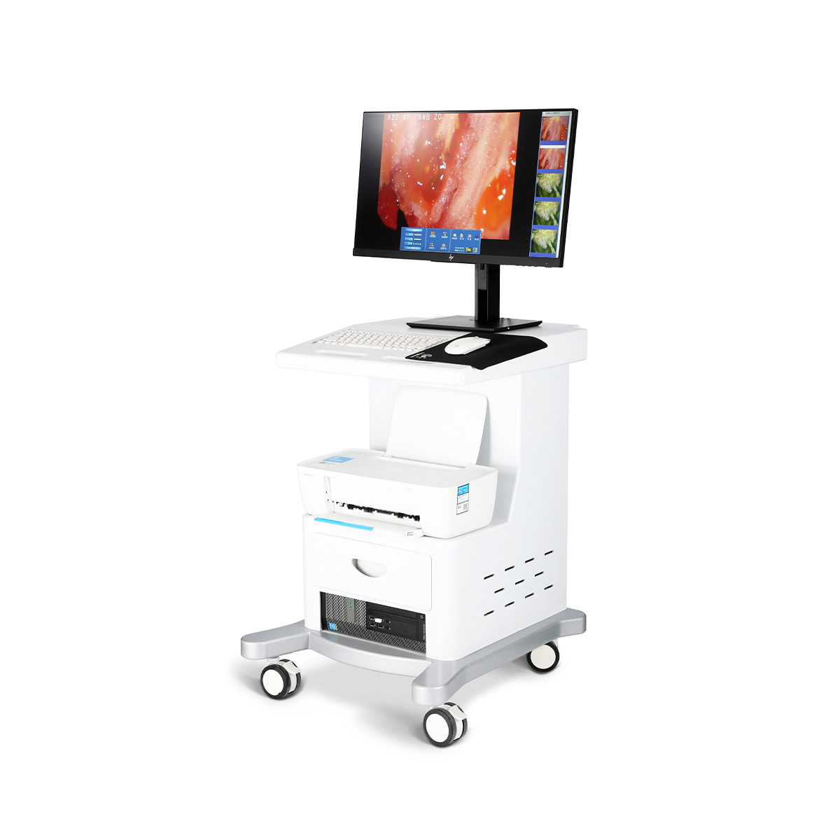 內置多圈環形高亮LED白色光源機構;搭配三級濾光功能、醋酸反應計時功能、品牌電腦配置、直立式支架可自由升降實時動態的圖像處理功能:放大、縮小圖像、凍結、采集、錄像回放、自動聚焦、存儲、再現、圖像處理、多光源切換等。